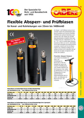 Die Absperr– und Prüfblasen sind aus hochwertigem Gummi mit Gewebe- einlagen gefertigt und gewähren auf Grund der speziellen Profilrillen eine optimale Abdichtung sowie sicheren Halt in der Leitung. Die spezielle Materialkombination ermöglicht einen langfristigen Einsatz bei Temperaturen von - 30 bis + 70 C und ist resistent gegen Abwässer mit einem pH-Wert von 2 bis 15. Jedes Modell ist für einen bestimmten Durchmesserbereich vorgesehen. Gewicht und Form der Blasen erlauben das problemlose Einfügen in die Leitung; sie lassen sich in kürzester Zeit aufblasen und sind daher im täglichen Profi-Einsatz sehr praktisch.