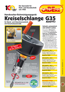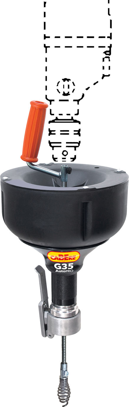 Die handliche G35 AutoPRO zur Reinigung von Abläufen bis zu 75mm Ø mit automatischem Wellen-Vor- und Rückschub*, ohne Anfassen der Reinigungswelle. Die unverwüstliche Trommel aus schlagfestem, bruchsicherem Kunststoff kann bis zu 15m Reinigungswelle aufnehmen. Das Modell G35 AutoPRO wird mit abnehmbarer Handkurbel geliefert, um das Gerät statt dessen auch mit einer handelsüblichen Elektronik-Bohrmaschine oder einem Akkuschrauber antreiben zu können.