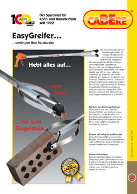 Der CABERE® EasyGreifer hebt alles auf...vom Cent...bis zum Ziegelstein. Er entfernt mühelos und sicher schwer erreichbare Gegenstände aller Art aus Kanälen, Schächten oder Gruben etc.. Sie werden Dutzende von Einsatzmöglichkeiten für dieses arbeitsparende und rückenschonende Gerät finden. Vergessen Sie unangenehmes Recken, Bücken und gefährliches Leitersteigen! Nehmen Sie den leichtgewichtigen und handlichen EasyGreifer, um Gegenstände aus Rohren oder Lüftungsschächten zu entfernen, um Kanalschächte und Gruben von Steinen und Schutt zu befreien und um Objekte an schwer erreichbaren Stellen zu greifen. Sie können sogar Golfbälle aus Teichen herausholen, Früchte von Bäumen pflücken oder hochhängende Glühlampen wechseln. Die Reihe der Anwendungsmöglichkeiten ist unendlich.